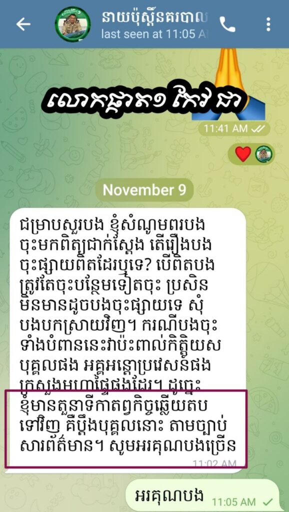 (ព្រៃវែង)៖ ថ្លែងក្នុងបទសម្ភាសន៍តាមប្រព័ន្ធTelegram នៅថ្ងៃ០៩.១១.២០២៥ លោកឧត្ដមសេនីយ៍ត្រី កែវ ជា នាយប៉ុស្តិ៍នគរបាលច្រកទ្វារព្រំដែនអន្តរជាតិកោះរកា បានទទួលស្គាល់ថា រូបលោកនិងមន្ត្រីក្រោមឱវាទ ពិតជាបានយកលុយពីកម្មករជនជាតិវៀតណាម ដែលធ្វើដំណើរចេញចូល តាមច្រកទ្វារព្រំដែនមួយនេះ ក្នុងម្នាក់ៗចំនួន២០.០០០ដុងលុយវៀតណាម ប្រាកដមែន..!!។
